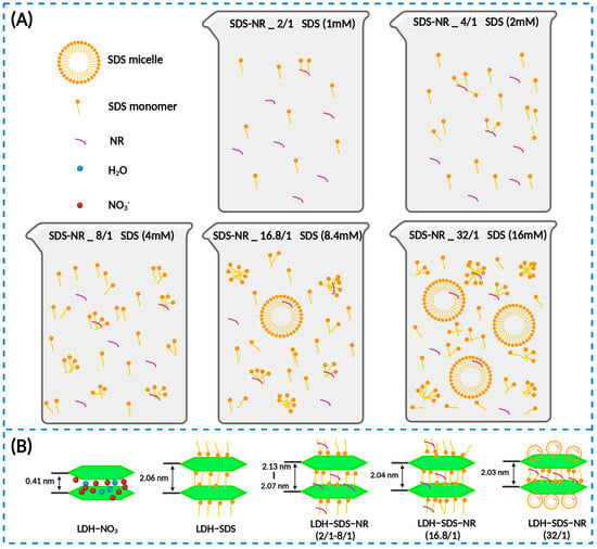 The schematic diagram of the effects of different molar ratios of SDS/NR feed on the dispersion state of SDS and the SDS/NR encapsulation system (A), as well as the loading behaviors of LDHs towards SDS/NR with different molar ratios (B). Created with BioRender.com.