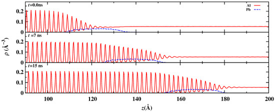 The instantaneous fine-scaled density profiles of the Al and Pb species during the NEMD. Top panel, density profiles are captured when the Pb nano-inclusion is started and being pushed at a steady-state rate. At this position, the simulation time is considered as 0.0 ns. Middle panel, density profiles are extracted based on the simulation trajectory after 7 ns. Bottom panel, density profiles are extracted based on the simulation trajectory after 15 ns.