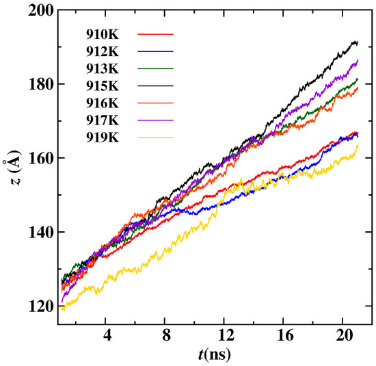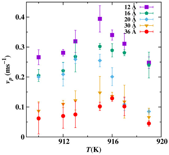 As the interface started pushing the immiscible nano-inclusion, then the real-time position is tracked using the center of mass of Pb, as shown in Figure 5. A 16 Å Pb nano-inclusion is pushed ahead of the interface at seven different temperatures; see Figure 5. To calculate the pushing velocity of nano-inclusion, we determined the gradient of distance covered by the center of mass with respect to time. This pushing velocity is the same as the crystal/melt interface velocity. In all of the five radius cases, the nano-inclusions were being pushed if the temperature was above 910 K, and the is shown in Figure 6. In Figure 6, when the temperature is high and near the melting point, then is low. When cooling increases, also increases up to an extent: for instance, for the 12 Å radius is low at 919 K, and its value increases as the temperature decreases to 915 K. This is because of the increase in driving force with undercooling. But with a further decrease in temperature from 915 K, the also decreases; this is because the interface become more curved and it takes more time for Al atoms to diffuse under the nano-inclusion. This trend of increasing in with undercooling up to an extent and decreasing is similar for the remaining magnitude of the radius cases. For the same temperature, smaller nano-inclusion radius cases have overall higher relationships.
