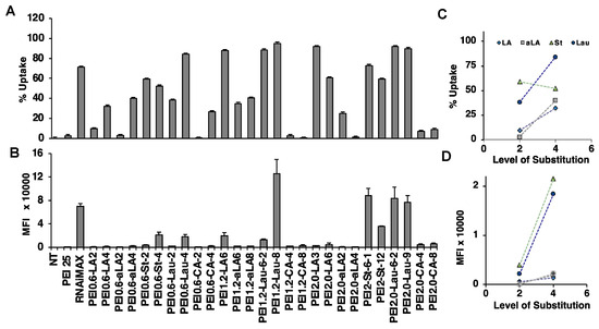 siRNA delivery to Raji Burkitt cells. siRNA delivery was examined at PEI/siRNA w/w ratio of 10:1 and FAM-siRNA concentration of 30 nM. (A) %Uptake (i.e., percentage of cells that are positive for FAM, and (B) mean fluorescence intensity (MFI) from the FAM-siRNA positive cells were assessed. (C,D). Effect of substitution level on the uptake (percentage of population and MFI, respectively). Each symbol represents a different substituent. NT: no treatment.