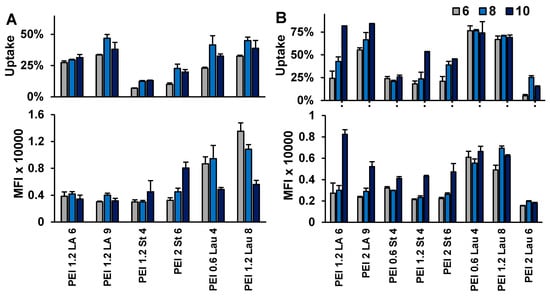A library of PEIs modified with saturated and unsaturated lipids was analyzed for FAM-siRNA delivery. We determined the percentage of cells displaying uptake and mean fluorescence/cell in Raji Burkitt cells (Figure 1; polymer/siRNA w/w ratio of 10:1), KG1 (Figure 2A; polymer/siRNA w/w ratios of 10:1, 8:1, and 6:1), and KG1a cells (Figure 2B; polymer/siRNA w/w ratios of 10:1, 8:1, and 6:1). The RNAiMAX and PEI25 were used as commercial reagents for comparison with in-house prepared PEIs. Based on the overall results, PEI1.2-Lau8 was consistently the most effective carrier with FAM-siRNA delivery up to ~95% of cells and with the highest fluorescence/cell in the cell lines. The PEI1.2-LA6 was also relatively effective in our screens, in line with previous studies that showed its effectiveness for delivery of siRNA to AML cells [42,43] (in addition to breast cancer MDA-MB-231 cells [44]). Other polymers effective in KG1 and KG1a cells and selected for further experiments were PEI0.6-Lau4, PEI1.2-St4, and PEI2-LA9. The LA substitution was the only unsaturated lipid modification successful in comparison to other substituents. We had previously hypothesized that increased unsaturation gave the carrier more fluidity, which allowed for better interactions with the cell membrane [29]. In general, we observed that the delivery efficiency was increased with increased substitution levels (Figure 1C,D). Our studies showed that PEI25 was not effective at all in Raji Burkitt cells as well as the starting PEIs (0.6 to 2.0 kDa) used in our synthesis, but RNAiMAX was quite effective in siRNA delivery, giving as good delivery as the most effective in-house synthesized polymers.