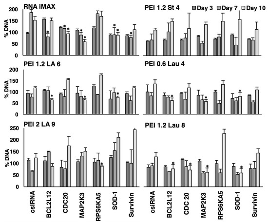 Effect on siRNA treatment on proliferation of Raji Burkitt cells. The effects of different siRNAs on DNA content were assessed on days 3, 7, and 10 after siRNA transfections on day 0 and day 7 using a library of specific siRNAs. The siRNA concentration was 50 nM, and the carrier/siRNA ratio was 10:1 for PEI1.2-LA6 and 2:1 for RNAiMAX. Percent DNA content is expressed compared to the control siRNA (csiRNA) sample. NT: not treatment sample. Dashed lines are intended to guide the eye for 100% indicative of no changes in DNA content.