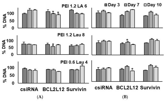 As we observed some toxicity with control siRNA complexes in both KG1a and KG1 cells at times, lower amounts of modified PEIs were used in complexes (polymer/siRNA ratio of 6:1) to assess if decreased polymer amount would eliminate the toxic effects. Only siRNAs targeting BCL2L12 and survivin were employed for this purpose (Figure 6). In both KG1 and KG1a cells, the growth inhibition observed with PEI1.2-LA6 and control siRNA at a ratio of 10:1 was mitigated by lowering the ratio to 6:1. Specific combination of polymeric carriers and siRNAs led to growth inhibition on day 7 and day 10 in KG1 cells, in particular PEI-1.2-LA6 and PEI1.2-Lau8 and BCL2L12 siRNA combinations. In KG1a cells, BCL2L12 siRNA decreased the growth on day 10 with PEI1.2-Lau8 and PEI0.6-Lau4 by ~30%. Survivin siRNA decreased the growth on day 10 with PEI1.2-LA6 but only by ~10%. In contrast, survivin siRNA was more effective in reducing cell growth on day 3 with the three carriers, giving ~20% growth inhibition on average (Figure 6), but this did not reach significance (p < 0.1).