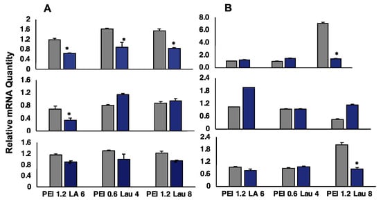 We used qPCR to assess the effect of siRNA delivery at the mRNA level. We analyzed the targets BCL2L12, survivin, and MAP2K3 in KG1a cells at the PEI/siRNA ratio of 6:1 (Figure 7A). The BCL2L12 was significantly silenced with all carriers, MAP2K3 was silenced with PEI1.2-LA6, and the survivin with PEI1.2-LA6 and PEI1.2-Lau8. In contrast, MAP2K3 was up-regulated with PEI0.6-Lau4. In KG1 cells (Figure 7B), PEI1.2-LA6 was the most effective at silencing survivin. The PEI1.2-Lau8 also achieved some silencing with BCL2C12 and surviving siRNAs, but PEI0.6-Lau4 did not have any effect on mRNA levels (Figure 7B), even though it was one of the more effective siRNA delivery agents for KG1 cells (see Figure 2).