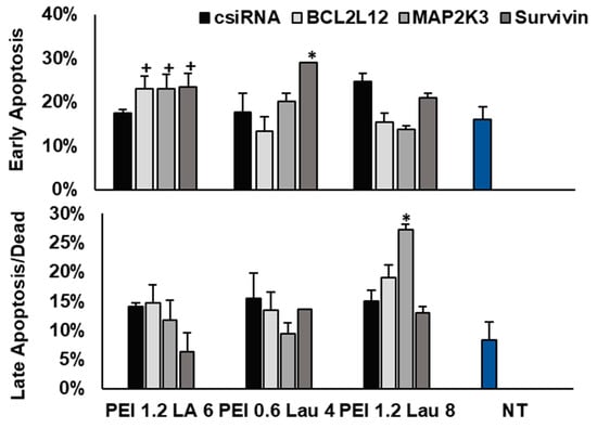 KG1A cell death after targeting BCL2L12, MAP2K3, and survivin with PEI1.2-LA6, PEI0.6-Lau4, and PEI1.2-Lau8. The annexin V and PI stain were used to determine the percentage of early apoptotic cells (annexin V+, PI−) or late apoptotic/dead cells (annexin V+, PI+). The analysis was performed after 3 days of siRNA treatment. +, *: groups with significant changes (p < 0.05) vs. csiRNA. NT: no treatment.