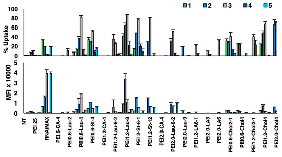 We again conducted a screen of in-house prepared PEIs for siRNA delivery to patient cells since we did not want to assume that the polymers identified from cell line studies were optimal for patient cells as well. Among the commercial carriers, RNAiMAX was relatively more effective than PEI25 in siRNA delivery (Figure 9). However, RNAiMAX gave a relatively lower percentage of siRNA delivery (2% to 33%), while the PEI1.2-Lau8 gave a higher percentage of siRNA-positive cells (3% to 87%), while the mean uptake was equivalent for both carriers in the select patient. Patient-to-patient variability in siRNA delivery was most evident for best-performing reagents; while patient 4 gave little uptake with both reagents, other patients displayed variable siRNA uptake for both reagents and AML patient cells (Figure 9). From the patient studies, PEI0.6-St4 was additionally selected as it consistently delivered FAM-siRNA at higher percentages in 3/5 patients (Figure 9).