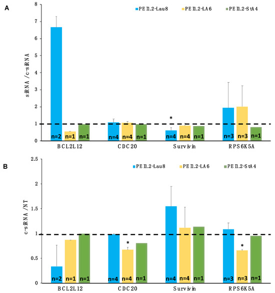 Silencing of BCL2L12, CDC20, survivin, and RPS6K5A using modified PEIs in AML patient samples. Four patient samples were obtained and tested for silencing using PEI1.2-Lau8, PEI1.2-LA6, and PEI1.2-St4 polymers. The polymer/siRNA w/w ratio was 10:1, and the siRNA concentration was 60 nM. The results are reported as (A) the ratio of mRNAs in cells treated with specific siRNA to control siRNA for n number of patient samples tested for specified targets and (B) ratio of control siRNA to no treatment (NT) to examine the effect of control siRNA on mRNA levels of chosen targets. Dashed lines show a ratio of 1, indicating no changes in the target mRNA levels. *: group with significant reduction from baseline (p < 0.05) and against CDC20 but not RPS6K5A silencing.