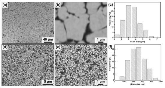 Backscattered SEM images and the corresponding grain size distributions of W in the commercial coarse-grained W–Cu (a–c) and UFG W–Cu composites (d–f).