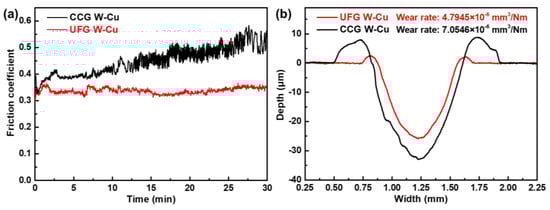 Friction coefficient curves (a) and wear scar profiles (b) of the CCG W–Cu and UFG W–Cu composites, respectively.
