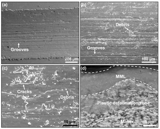 In order to shed light on the underlying wear mechanisms and reveal the origin of the low friction coefficient and wear rate in the UFG W–Cu composite, we further investigated the surface morphology and cross-sectional microstructure of the wear scars. As shown in Figure 4a,b, many grooves parallel to the sliding direction and debris were found on the worn surface of the CCG W–Cu composite; that debris can be as large as several microns. In addition, some fatigue cracks were also found on the worn surface (Figure 4c), which were thought to be caused by the continuous reciprocating slide load and would result in the formation of debris [33]. By contrast, as shown in Figure 5a–c, grooves, debris, and fatigue cracks were also found on the worn surface of the UFG W–Cu composite. However, the debris on the UFG W–Cu composite were much smaller than that in the CCG W–Cu composite, which further led to much narrower grooves in the UFG W–Cu composite, since grooves were typically caused by the scratches of the worn debris. It can then be concluded that abrasive wear and fatigue wear are the dominant wear mechanisms for both UFG W–Cu and CCG W–Cu composites, which is also consistent with previously reported results [29].