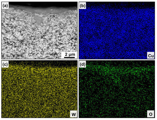 (a) Cross-sectional microstructure under the wear scar of the UFG W–Cu composite and (b–d) the corresponding elemental distributions.