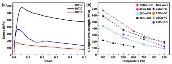 While pure tungsten has excellent high-temperature strength, copper can be extremely soft at high temperatures. It was reported that the strength of copper was less than 30 MPa at 900 °C [35,36]. As a result, the strength of W–Cu composites usually decreases with temperature. However, W–Cu composites have to withstand severe contact-loading at high temperatures in many domains, making high-temperature strength a crucial indicator for applications. Therefore, the compressive behavior of the UFG W–Cu composite was studied. The strain–stress curves of the UFG W–Cu composite at different testing temperatures are shown in Figure 8a. It can be found that the UFG W–Cu composite exhibited a gradually declined compressive strength of ~680 ± 10 MPa, 364 ± 14 MPa, and 180 ± 6 MPa with the temperature raised from 300 °C to 600 °C and 900 °C, which were ~1.55 times, ~1.72 times, and ~1.80 times that of the coarse-grained W–Cu composites. Evidently, grain refinement has greatly enhanced the high-temperature strength of the W–Cu composite. According to the previous study [30], the high strength of UFG W–Cu composites at room temperature was attributed to the load-bearing effect of tungsten and the dislocation strengthening induced by the grain boundaries and phase boundaries. As the temperature was raised, the motion of atoms and dislocations was intensified [37,38], and the critical shear stress required for dislocation slip was reduced [39], so the strength of both copper and tungsten decreased with temperature. Comparatively, however, tungsten remained in a hard phase at high temperatures, making it the dominant load-bearing phase. Moreover, compared with the coarse-grained W–Cu composites, grain refinement enhanced the high-temperature strength of the tungsten phase in the UFG W–Cu composite [37]. Thus, the load-bearing capacity of the tungsten phase was improved in the UFG W–Cu composite. In addition, despite the increased dislocation motion, the largely increased phase interfaces in the UFG W–Cu composite can hinder and accumulate dislocations more efficiently [35]. Therefore, the improved high-temperature strength of the UFG W–Cu composite should be attributed to the enhanced load-bearing effect and dislocation strengthening induced by the grain refinement.