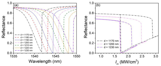 Figure 4a shows the variation of nonlinear reflectance spectrums with the silica layer thickness d varying from 1170 to 1230 nm with a step of 10 nm. Other structural parameters are the same as those in Figure 2 and Figure 3, and meanwhile, is fixed to 1.75 MW/cm2 to make a comparison with the magenta curve in Figure 3a. From the graph, we see that the resonant wavelength blue shifts as d decreases and vice versa, which can be explained by the optical coherence theory. The shift of the resonant wavelength with the deviation of d is approximately linear (1.2 per 10 nm) within the simulation range. The peak absorption of the structure shows better stability to the deviation of d compared with the resonant wavelength. As is shown in the graph, the structure maintains a considerable peak absorption of over 98% within the simulation range, which means that the extinction ratio of bistable states at 1.75 MW/cm2 is very stable, even if d deviates 30 nm away from the optimized value. Figure 4b shows the hysteresis loops with d = 1170, 1200, and 1230 nm at their corresponding working wavelengths, which are 1541.7, 1545.6, and 1549.2 nm, respectively. Bistable characteristics are clear enough for all cases. Apparently, the switching-off-to-on thresholds are maintained at nearly 1.7 MW/cm2, and the extinction ratios at 1.75 MW/cm2 are still very high, which are 18.8 and 19.7 dB for d = 1170 and 1230 nm. The switching-on-to-off threshold decreases with d increasing, which has a trend to slightly cut down the structural Q factor.