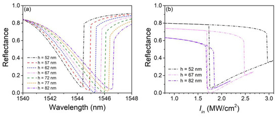 Figure 5a shows the shift of nonlinear reflectance spectrums with the grating thickness h varying from 52 to 82 nm with a step of 5 nm. Other structural parameters are still the same as those in Figure 2 and Figure 3, and is also fixed to 1.75 MW/cm2. The change of h has only a slight influence on the resonant wavelength, which shifts no more than 1.5 nm within the simulation range. Its influence on the peak absorption is much stronger compared with that of the silica layer thickness. The peak absorptions drop to 93.4% and 95.7% for h = 52 and 82 nm, respectively. Moreover, the jump of reflectance at the right side of the resonant wavelength is weakened with h increasing, indicating that the structural bistable behaviors will be affected. Figure 5b shows the hysteresis loops with h = 52 nm, 67 and 82 nm at their corresponding working wavelengths, which are 1544.3, 1545.6, and 1546.5 nm, respectively. The extinction ratios at 1.75 MW/cm2 are 13.5 and 13.7 dB for h = 52 and 82 nm, respectively. Apparently, the hysteresis loop sharply shrinks with h increasing since h directly determines the mode leakage rate of the structure and has a tremendous influence on the structural Q factor. It is predictable that the hysteresis loop is going to vanish if h further increases unless a higher is selected for the simulation.