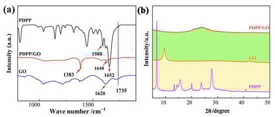 FT-IR (a) and XRD (b) spectra of GO, PDPP, and PDPP/GO.