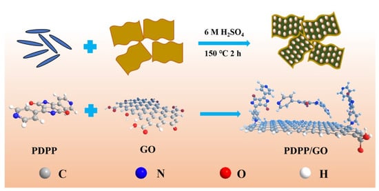 Graphene oxide (GO) was prepared by the Hummers method [], and the as-prepared GO (0.1002 g) was sonicated for 2 h in ultrapure water (45 mL) to obtain a homogeneous suspension. Second, PDPP (0.0200 g) was dissolved in concentrated sulfuric acid (5 mL) and then slowly added to the GO dispersion. Then, the mixed solution was placed in a stainless Teflon liner and heated at 150 °C for 2 h. The precipitate was filtered and washed successively by 6 M H2SO4 and ultrapure water to remove unreacted PDPP and dried at 60 °C for 24 h. The obtained composite material was marked as 20% PDPP/GO. Other proportions of PDPP/GO composites (10%, 15%, 20%, 25%) were also obtained following the above method.