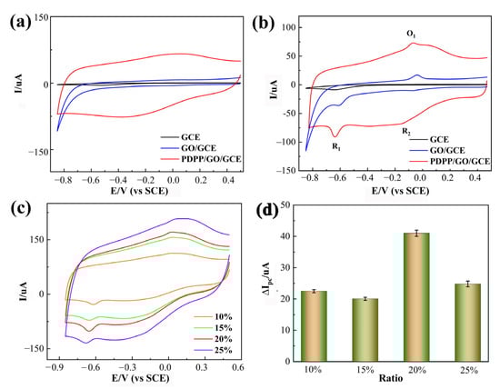 CVs of different electrodes (GCE, GO/GCE, PDPP/GO/GCE) in 0.1 M PBS (pH 6.5) without (a) and with (b) 0.01 mM chloramphenicol; (c) CVs of PDPP/GO/GCE at different ratios, 10%, 15%, 20%, and 25%, in 0.1 M PBS (pH 6.5) containing 0.01 mM chloramphenicol; (d) absolute peak reduction current (∆I) vs. the ratio from the CVs. All scan rates: 50 mV/s.