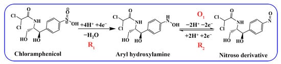 In the CV curve of electrocatalytic CAP at PDPP/GO/GCE, the reaction of R1 can be ascribed to four electrons and four protons in a reduction process in which the nitro group of CAP is reduced to aryl hydroxylamine [,]. These redox peaks at O1 and R2 correspond to the two electron and two proton transfer mechanism between the nitroso group derivative and hydroxylamine [], as displayed in Figure 6. Different doped ratios of PDPP were also investigated by CV in Figure 5c. As the PDPP increased, 20% PDPP/GO/GCE showed the best catalytic activity for CAP with the largest absolute peak reduction current (∆Ipc = 18.9 uA) in Figure 5d, so the 20% PDPP/GO/GCE was used for subsequent tests and labeled PDPP/GO/GCE.