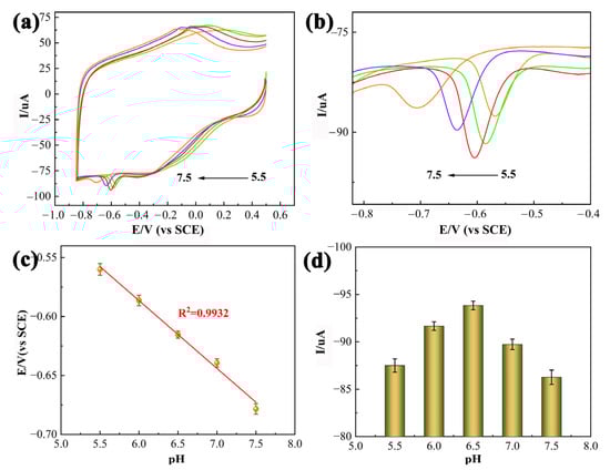 The equation expresses a slope value of 0.0578 V/pH (Figure 7c), which matches the theoretical value of 0.0591 V/pH and demonstrates that the reduction process of the nitro group of CAP to hydroxylamine at the PDPP/GO/GCE is accompanied by an equal number of protons and proton transfer []. Figure 7d shows the plot of Ipc versus the pH value. The Ipc of CAP increased until the pH value increased to 6.5 and then decreased. Hence, the optimal pH value of PBS was 6.5 for the electrocatalytic reduction of CAP at the PDPP/GO/GCE.