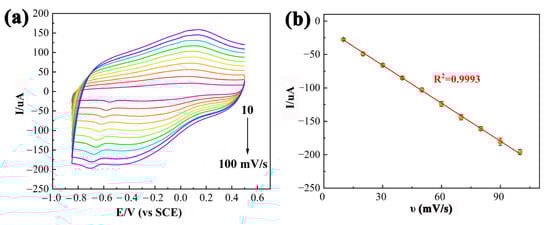 The effect of the scan rate (υ) on the PDPP/GO/GCE was also studied by CV with various scan rates from 10 to 100 mV/s in 0.1 M PBS (pH 6.5) containing 0.01 mM CAP (Figure 8a). As the scanning rate increased, both the Ipc and Epc of CAP (R1) gradually increased. In addition, the Ipc was proportional to the scan rate based on the linear equation, Equation (2), as displayed in Figure 8b.