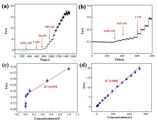 Under optimal conditions, the amperometric (i-t) response at a fixed potential of −0.62 V was determined to evaluate the sensing performance of PDPP/GO/GCE with a time interval of 50 s. As displayed in Figure 9a, the i-t curve showed a stable and well-defined amperometric response with the addition of CAP, even at a low concentration in the enlarged view in Figure 9b. A steady current was achieved within 3 s, reflecting the rapid response of PDPP/GO/GCE. Figure 9c,d shows the relevant calibration curve between the concentration of CAP and the current, and the PDPP/GO/GCE responded linearly to CAP from 0.01 to 780 uM with equations of I = −0.0895C − 0.2445(R2 = 0.9978) (0.01–1 uM) and I = −0.0251C − 0.6682(R2 = 0.9988) (1–780 uM). The limit of detection (LOD), 1.64 nM, can be calculated by 3 σ/S, where σ represents the standard deviation of the intercept of the regression line and S is the slope of the calibration curve. Compared to the published CAP sensors in Table 1, it is noteworthy that the as-prepared PDPP/GO/GCE sensor had superior sensing performance in either the linear range or at the LOD.