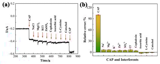 The selectivity of the PDPP/GO/GCE to detect CAP was evaluated by measuring the current at a fixed potential in the presence of potential interferents (Figure 10a). In the test, 100-fold concentrations of inorganic ions, including Na+, Mg2+, K+, Zn2+, SO42−, and Cl−, were added to 0.1 M PBS (pH 6.5) with 5 uM of CAP, and the results reveal that the PDPP/GO/GCE quickly and significantly responded to CAP rather than the above interferents. Furthermore, cephalexin, ascorbic acid, L-cysteine, and catechol with concentration of 50 uM were evaluated, which had no significant effects on the CAP signal. Figure 10b shows the relative error caused by different interferents in the detection of CAP, and the current signal of CAP at the PDPP/GO/GCE remained stable even in the presence of high concentrations of interferents. These results indicate that the constructed sensor has outstanding anti-interference performance.