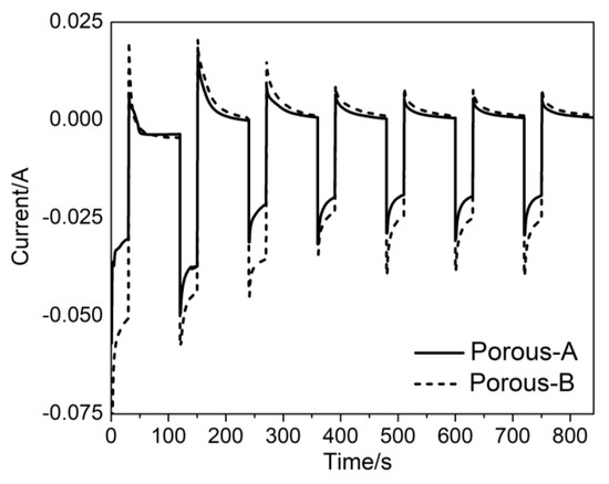 Along with the dense NWs, mesoporous counterparts have also been produced by electrodepositing from the FePd + P123 electrolyte at Eon = −1.2 V vs. Ag/AgCl over 20 and 100 nm Au-sputtered AAO templates; from here onwards the former will be addressed as Porous-A while the latter as Porous-B samples. Figure 3 displays the pulsed potentiostatic transients for Porous-A and Porous-B where current vs. time is recorded. The electrodeposition in both cases appeared to be homogeneous and consistent.