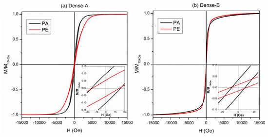 All the investigated NWs were ferromagnetic despite their relatively large Pd content. Ferromagnetic properties in FexPd1−x alloys are well documented, even for Pd percentages exceeding 80 at.% [49]. The room-temperature hysteresis loops of the Dense-A and Dense-B samples are shown in Figure 8. The curves obtained by applying H along the direction parallel (PA) and perpendicular (PE) to the major axis of the NWs were compared for both samples; all curves were normalized to the magnetization value at H = 15 kOe. The values of the magnetic properties such as saturating field (Hs), coercive field (Hc), magnetic susceptibility evaluated at the coercive field (χHc), and the squareness ratio (Mr/Ms) are reported in Table 2.