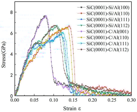 The engineering stress–strain curves of eight models under tensile loading are shown in Figure 2, along with the detailed figure of their elongations, tensile strength, and Young’s modulus, as shown in Table 4. It can be seen from Figure 2 that changes in the terminal atoms type of the SiC(0001) plane had little influence on the regularity of the stress–strain curves, and there were only a few differences that existed in the elongations and tensile strength of each pair. However, the stress–strain curves exhibited great diversity when changing the Al plane of the interfaces. The SiC(0001)/Al(001) models broke with the highest tensile strength and smallest elongation, and the relationships between their stress and strain maintained linearity before fracture, meaning that the SiC(0001)/Al(001) models suffered higher stress under the condition of less strain. The other models, except for the SiC(0001)/Al(001) models, exhibited larger elongations with visible yielding phenomena, but their tensile strength was relatively low. It was evident from Table 4 that the elongations of the SiC(0001)/Al(110) models were the largest of all, and the models with a higher Young’s modulus had lower elongations.