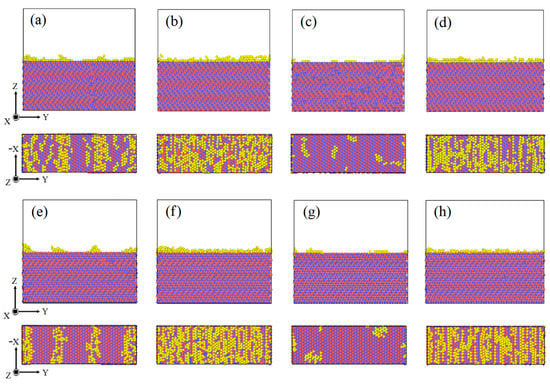 A Wigner–Seitz defect analysis was conducted on eight SiC(0001)-Si/Al interface systems of relaxed states. The Al-atoms which were not in the original lattice space were colored yellow, as shown in Figure 3. It was noted that the Al-atoms in the interface region of eight models deviated their original FCC lattice spaces at different amounts, which was driven by the stronger Si-Al bonding and C-Al bonding compared to the Al-Al bonding [34]. Therefore, the Al-atoms two to three layers away from the heterogeneous interface were affected due to a lattice mismatch, and their normal placing mode was also disturbed. However, it can be seen from Figure 3c,g that most Al-atoms in the SiC(0001)/Al(111) model were located on the standard lattice space, indicating that the SiC(0001)/Al(111) model showed the least lattice mismatch.