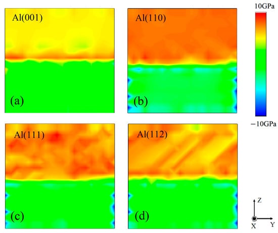 Stress distribution before cracks’ nucleation of four SiC(0001)-Si/Al interface systems: (a) SiC(0001)-Si/Al(001), (b) SiC(0001)-Si/Al(110), (c) SiC(0001)-Si/Al(111), (d) SiC(0001)-Si/Al(112).