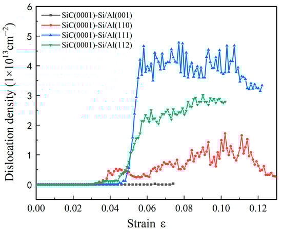 In order to better understand the deformation behaviors observed in Figure 4, the atomic structure and dislocation of four SiC(0001)-Si/Al interface systems were studied during the tensile process. Figure 6 illustrates the variation in the dislocation density of the four models under tensile loading. Moreover, Figure 7 shows snapshots of the typical structures and the corresponding dislocation at each specific strain of the four interface models. It is evidenced from Figure 6 that there was almost no generation of a dislocation during the tensile loading on the SiC(0001)-Si/Al(001) model. The FCC structure was also maintained through the whole deformation process, as can be seen in Figure 7a,b, which conforms to the results observed in Figure 3a–d. The dislocations in the SiC(0001)-Si/Al(110) model began to generate when the strain reached 0.035. In the meantime, the 1/6 <112> Shockley partial dislocations nucleated in the Al matrix and arched out from the interface region. Then, the dislocations glided along the [110] direction on the {111} plane of the Al matrix, leaving intersecting stacking faults; the corresponding snapshots are shown in Figure 7c,d. The dislocation continuously moved and reacted until the strain reached 0.11, when the number of the dislocations detected in the model began to show a downward trend, as can be seen in Figure 6. The reason for this phenomenon can be attributed to the large elongations of the SiC(0001)-Si/Al(110) model. At the later deformation stage, the model is excessively stretched, which makes the Al-atoms arranged irregularly, and the dislocation is no longer detected. As for the SiC(0001)-Si/Al(111) model, the dislocation density ascended rapidly when the strain increased to 0.049, and multiple 1/6 <112> Shockley partial dislocations were activated simultaneously. Some dislocations reacted during the movement to generate the 1/6 <110> stair-rod dislocations, contributing to a unique dislocation configuration in the Al matrix (Figure 7i), which consisted of three 1/6 <110> stair-rod dislocations lines and three stacking faults. As the strain continued to rise, a large number of dislocations expanded and entangled with each other, forming a massive deformation in the Al matrix (Figure 7e,f). Finally, there was a slight downward trend in the dislocation density as the SiC(0001)-Si/Al(110) model did. The dislocation in the SiC(0001)-Si/Al(112) model occurred at a strain of 0.046. In addition, the dislocation reaction contributed to a stable dislocation configuration (Figure 7j), which consists of two 1/6 <112> Shockley partial dislocation lines, one 1/6 <110> stair-rod dislocation line, and two stacking faults, also known as the Lomer–Cottrell (L-C) locks [37]. This dislocation configuration restricted the continuation of the deformation in certain directions due to the inoperable nature of the 1/6 <110> stair-rod dislocations. Hence, the 1/6 <112> Shockley partial dislocations slide with two stacking faults along the 1/6 <110> stair-rod dislocation direction, as shown in Figure 7g,h.
