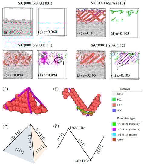Snapshots of the typical structures and the corresponding dislocation features of (a,b) SiC(0001)-Si/Al(001) model, (c,d) SiC(0001)-Si/Al(110) model, (e,f) SiC(0001)-Si/Al(111) model with (i,i′,i″) defect configuration found in this model, and (g,h) SiC(0001)-Si/Al(112) model with (j,j′,j″) defect configuration found in this model. The structures are colored using the PTM method. HCP, BCC, and unknown structures are colored red, blue, and white, respectively (with FCC structures neglected). The dislocations are colored using the DXA method. The 1/6 <112> Shockley partial dislocations and 1/6 <110> stair-rod dislocations are colored green and purple, respectively.