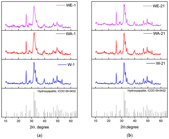 Thus, according to the FTIR data, the 21-day ripening process led to a significant increase in the overall spectral resolution, particularly for the OH− bands at 3571 and 633 cm−1. The spectra of W-21 were characterized by the highest intensity of these bands; the WE-21 and WA-21 spectra demonstrated the more pronounceable difference between the ripened and the as-synthesized materials. The broad peaks of the adsorbed water, CO2, and NH3 became weaker, indicating a decrease in the adsorption capacity of the materials. The carbonate introduction in the HA structure seemed to predominantly lead to the formation of B-type substituted HA.