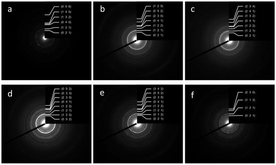 SAED ring patterns and Miller indexes of the powder samples W-1 (a), WA-1 (b), WE-1 (c), W-21 (d), WA-21 (e), WE-21 (f).