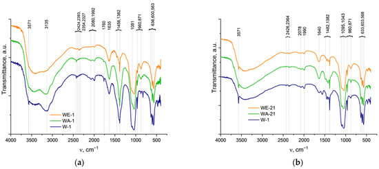 The CO2 may not only adsorb on the surface of the sample but may also introduce the HA structure, forming A, B, or AB types of carbonated hydroxyapatite, respectively [35]. Thus, the samples ripened for 1 day were characterized by bands at 1401, 1455, and 873 cm−1, which denoted that CO2 predominantly formed a B-type CO32− substitution [38]. Additional weak bands at 1542 cm−1 and a broadening of the 873 cm−1 band reflected the minor presence of an A-type CO2 substitution for WA-1. For all samples, after ripening for 21 days, we noted the broadening of the band positioned at 875 cm−1, which could be simultaneously related to A-type (878 cm−1) and B-type (873 cm−1) carbonates, as well as to hydrophosphate (HPO42−). These could indicate the formation of an AB-type carbonate substitution. For W-21, bands at 1419, 1455, and 1550 cm−1 confirmed an AB-type substitution, while for WE-21 and especially for WA-21, the disappearance of the band at 1550 cm−1 ν3(CO32−) indicates the predominating formation of B-type substituted HA and may reflect the contribution of HPO42− in the 875 cm−1 band’s broadening.