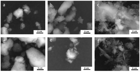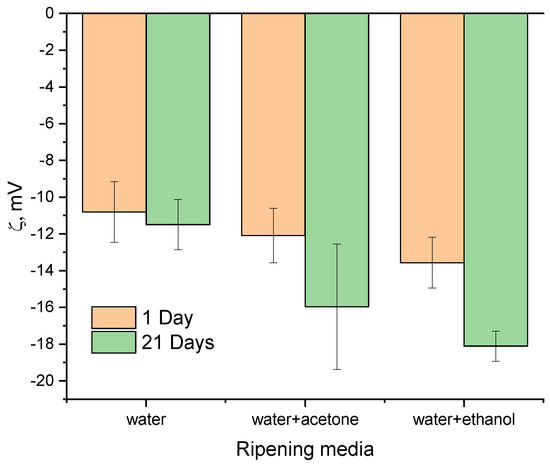 The particles of all the samples formed agglomerates, and the spaces between them contributed to the porosity of the material. According to the SEM (Figure 5) and TEM results, the process of ripening in the mother solution contributed to the formation of the looser agglomerates, as compared to the samples after synthesis. The decrease in the degree of powder agglomeration was further confirmed by measuring the zeta potential.
