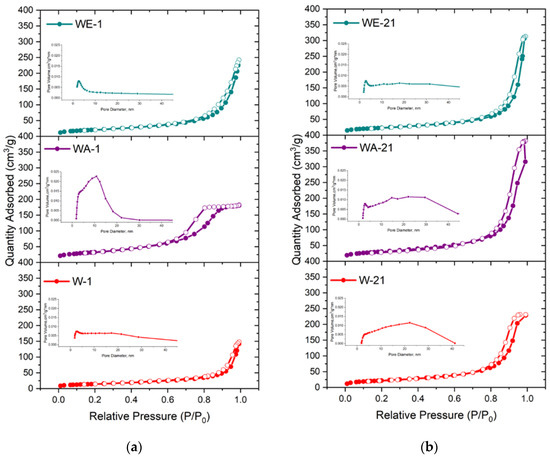 According to the BET data, the powders’ adsorption–desorption isotherms were characterized as type-IV according to the IUPAC as evident in the formation of the mesoporous materials (Figure 6) [40]. The hysteresis loops of the W-1 and WE-1 samples were attributed to H3-type behavior. This type is characterized by split-shaped pores caused by the aggregation of plane-parallel and rod-like particles [28]. The powders obtained via the water–acetone medium (WA-1) were characterized by the H2-type hysteresis loop, which is typical for a corpuscular structure with an irregular pore shape. After ripening, all of the powders were characterized by the presence of an H3-type hysteresis loop and micropores according to the t-plot.