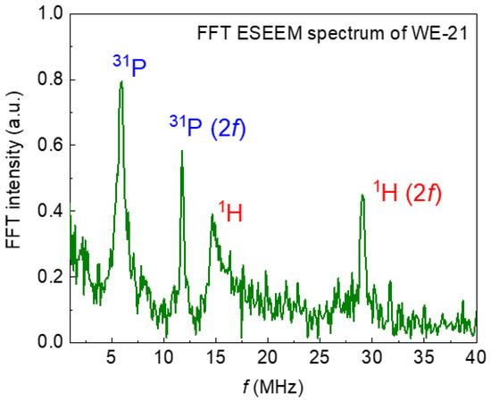 The recorded EPR spectra (in pulse mode at room temperature) are shown in Figure 8. The mentioned complex—nitrogen radical, due to the presence of a nuclear magnetic moment in nitrogen 14N, can serve as a spin label or “probe” for the analysis of the local environment, providing information about its structural changes under various effects on the sample [46]. This fact is also confirmed by the electron spin-echo envelop modulation (ESEEM) spectrum, which contains resonant signals from hydrogen and phosphorus nuclei (Figure 9). The resonance lines in the frequency domain are located following the Larmor frequencies of the nuclei, depending on the fixed magnetic field (B0) and the nuclear gyromagnetic ratio (γn): νLarmor = γn*B0. This result indicates that the nitrogen radical is contained in the crystal lattice of the sample and surrounded by structural elements (1H and 31P). The presence of three anisotropic components in the EPR spectra (Figure 8) is caused by the hyperfine dipole–dipole interaction between the electronic and nuclear magnetic moments. As can be seen in Figure 8a,b, the comparative analysis shows no difference between the EPR results obtained from the samples synthesized in the different media (water, ethylene, and acetone). The results, depending on the synthesis medium, are the same for each ripening period (1 day (as-synthesized) or 21 days). Obvious differences in the spectra are observed for the samples, depending on the ripening periods of 1 and 21 days (Figure 8c). The simulation and the description of the EPR spectra using the spin Hamiltonian (2), which includes the anisotropic Zeeman term and the hyperfine interaction tensor (presented in Figure 5c as a green, dashed line), are obtained as follows: