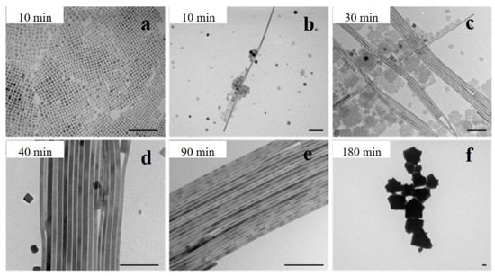 TEM images of the CsPbBr3 nanostructures synthesized with different reaction times: (a) less than 10 min, (b) after 10 min, (c) 30 min, (d) 40 min, (e) 90 min, and (f) 180 min. Scale bar: 100 nm. Reprinted with permission from reference [16]. Copyright 2015, American Chemical Society.