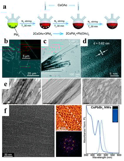 - Imran, M.; Di Stasio, F.; Dang, Z.; Canale, C.; Khan, A.H.; Shamsi, J.; Brescia, R.; Prato, M.; Manna, L. Colloidal synthesis of strongly fluorescent CsPbBr3 nanowires with width tunable down to the quantum confinement regime. Chem. Mater. 2016, 28, 6450–6454. [Google Scholar] [CrossRef] [PubMed]