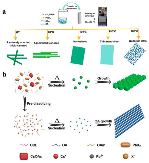 Although various methods have been used to prepare ultra-thin CsPbX3 NWs, the yields of these NWs is low [40]. In addition, stability is another issue when the diameter of the NWs is too small [39]. The solvothermal method involves the addition of a perovskite precursor and solvent to a high-pressure reaction kettle and reaction at a specific temperature for a particular time. When compared with existing synthetic methods, the solvothermal method involves simple steps, the precise control of the composition and morphology, and the high crystallinity of the synthesized products. Giri et al. added OA and OAm to a DMF solution containing MABr and PbBr2, and the mixture was allowed to react in an autoclave for 30 min. They regulated MAPbBr3 NCs with different morphologies by varying the reaction temperature (60 − 180 °C), as shown in Figure 8a [85]. Chen et al. also synthesized high-quality all-inorganic perovskite nanocrystals using a solvothermal method. As shown in Figure 8b, when the precursor was heated directly without dissolution, the concentration of the precursor ions was relatively low. The precursor dissolved gradually with increasing temperature and a relatively small amount of CsPbX3 NCs nucleated at a specific precursor concentration. With the help of the capping ligands, the nuclei eventually grew into nanocubes. In contrast, predissolving precursors can form a high concentration of precursor ions. More nuclei formed when the solution was heated, resulting in smaller nuclei. Finally, uniform NWs were formed by increasing the growth time instead of the nanocubes [53].