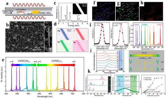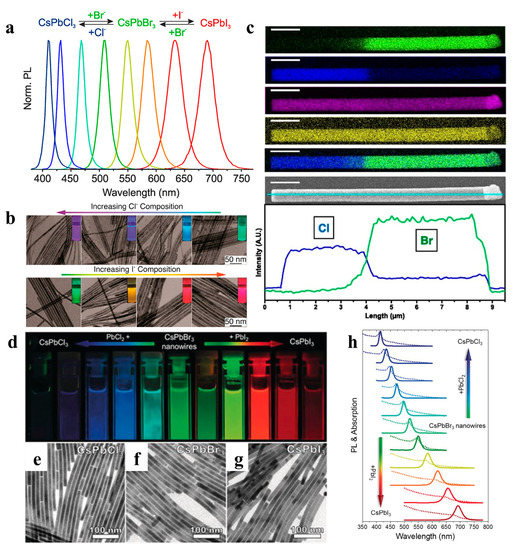- Dou, L.; Lai, M.; Kley, C.S.; Yang, Y.; Bischak, C.G.; Zhang, D.; Eaton, S.W.; Ginsberg, N.S.; Yang, P. Spatially resolved multicolor CsPbX₃ nanowire heterojunctions via anion exchange. Proc. Natl. Acad. Sci. USA 2017, 114, 7216–7221. [Google Scholar] [CrossRef]