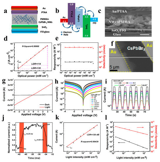 Zhou et al. reported selfpowered perovskite-NW PDs with a vertical P-I-N structure, in which CsPbBr3 NWs were grown using a combination of a solution-phase process and halide exchange (Figure 12a–e). The CsPbBr3 NW PDs show high selfsupplied electrical performance with ultrahigh on/off ratios of above 106, a responsivity of up to 0.3 A W−1, and a detectivity of up to 1 × 1013 Jones [98]. Semiconductor NWs with large-scale directional growth are required for future device developments [122,123]. Pan et al. reported the successful growth of ultra-long directional CsPbBr3 NWs in the gas phase using the figure-axis effect on an annealed M-faced sapphire substrate. These NWs were well aligned along the substrate grooves and were several millimeters in length, enabling a high-performance PD with a responsivity of 4400 A W−1 and a response speed of 252 μs (Figure 12f) [99]. Owing to the toxicity of Pb in perovskite materials, their commercial development remains challenging. Nontoxic tin is considered a potential replacement for Pb. Tang’s group used a two-step solution method to synthesize CsPbxSn1−x(BryI1−y)3 perovskite NWs. As shown in Figure 12g, the PDs of the perovskite NWs exhibited high performance with a rise/fall time of 4.25/4.82 ms and a detectivity of 2 × 1010 Jones [100].Zhou et al. adopted the hot-pressing welding method to reduce the interface and improve the quality of the CsSnI3 NWs. A high-performance NW PD was obtained with a responsivity of 9.9 × 10−3 A W−1 and a detectivity of 7.2 × 108 Jones [101].