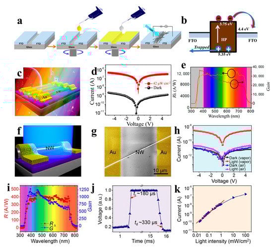 (a) Two-step all-solution synthesis of NW-based PD. (b) Energy band alignment of the HP and FTO films in a device under illumination. Reproduced with permission from reference [102]. Copyright 2018, Elsevier. (c) Schematic diagram of PD fabricated with MAPbI3 perovskite NW array. (d) I − V measurement result of the PD under the conditions of darkness and illumination. The wavelength of light is 550 nm with 42 μW cm−2 intensity. (e) The responsivity and photoconductive gain of PD versus the wavelength of light. Reproduced with permission from reference [103]. Copyright 2017, American Chemical Society. (f) Schematic diagram of the PD based on a single MAPbI3 NW. (g) SEM image of the PD. (h) Dark/photocurrent of the PD fabricated with MAPbI3 NW prepared under vapor and air conditions (light intensity is 60 μW cm−2). (i) The responsivity and photoconductive gain of the PD versus light wavelength. (j) The rise or decay edges of the PD. (k) Photocurrent of PD under different light intensities. Reproduced with permission from reference [104]. Copyright 2018, American Chemical Society.