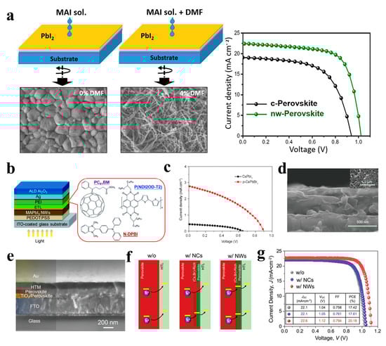- Singh, R.; Suranagi, S.R.; Yang, S.J.; Cho, K. Enhancing the power conversion efficiency of perovskite solar cells via the controlled growth of perovskite nanowires. Nano Energy 2018, 51, 192–198. [Google Scholar] [CrossRef]