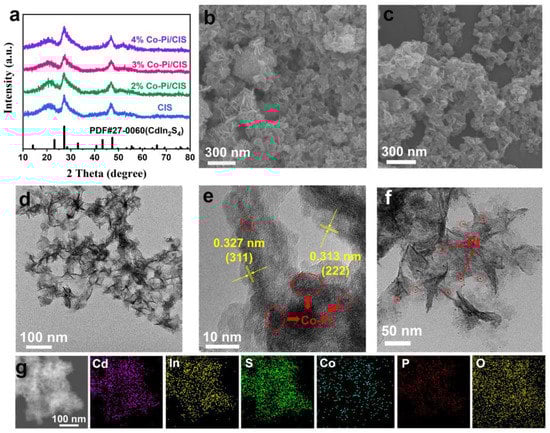 XRD was used to study the phase and crystal structure of CIS and Co-Pi/CIS photocatalysts. As shown in Figure 1a, all diffraction peaks can be assigned to cubic phase CdIn2S4 (JCPDS No. 27-0060) []. Diffraction peaks at 27.25° and 47.41° correspond to the (311) and (400) planes of CIS, respectively []. Due to the amorphous nature and small amount of Co-Pi, the XRD pattern of Co-Pi/CIS composite is basically consistent with that of CIS []. The nanostructure of the samples was characterized by SEM and TEM. From Figure 1b, c, it can be seen that CIS possesses a two-dimensional sheet-like structure with a size of 30–50 nm, and its topography is basically unchanged after loading Co-Pi. Figure 1d is the TEM image of Co-Pi/CIS, showing the small lateral dimension of ~50 nm and ultrathin thickness of ~5 nm of CIS. However, the presence of Co-Pi cannot be identified under these circumstances. Further observation by high-resolution TEM (HRTEM) shows that the lattice fringes with plane spacing of 0.313 nm and 0.327 nm in Figure 1e closely match the (222) and (311) planes of the cubic CIS, respectively. Some fuzzy and disordered dark spots can be observed on CIS surface, which may be assigned to amorphous Co-Pi clusters. Moreover, Pt nanoparticles were loaded on CIS (Pt/CIS) as a comparison, through a similar photodeposition process. Figure 1f is the TEM image of Pt/CIS, indicating that Pt nanoparticles are evenly deposited on the surface of CIS nanosheets. In the energy dispersive X-ray spectroscopy (EDS) element mapping of Co-Pi/CIS (Figure 1g), elements of Cd, In, S, Co, P, and O were simultaneously detected and evenly distributed, which demonstrates the presence of Co-Pi.