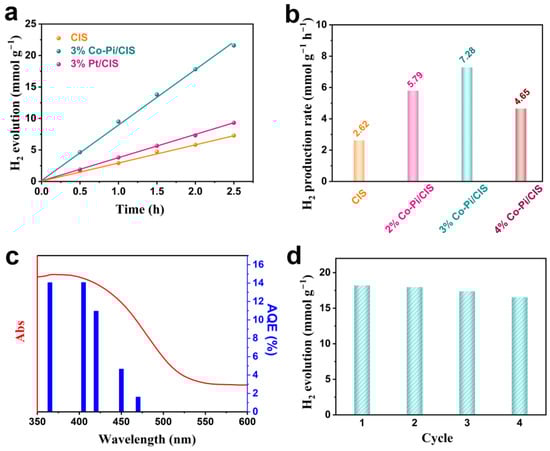 (a) Photocatalytic H2 evolution over CIS, Co-Pi/CIS and Pt/CIS under visible light irradiation, (b) photocatalytic H2 evolution rate of CIS and x% Co-Pi/CIS, (c) wavelength dependence of apparent quantum efficiency (AQE) and the absorption spectra of Co-Pi/CIS, and (d) cyclic photocatalytic H2 production property of Co-Pi/CIS.