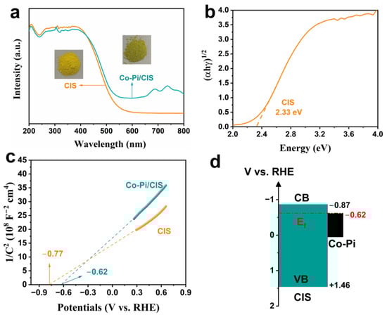 The absorption spectra of CIS and Co-Pi/CIS were derived from UV-vis DRS, which characterizes the optical properties of the samples. As shown in Figure 4a, the examined samples exhibit similar absorption band edges at about 530 nm, indicating that the modification of Co-Pi does not change the band structure of CIS. Compared to the pristine CIS, Co-Pi/CIS possesses enhanced spectra absorption in the range of 500–800 nm, which is consistent with the color of the samples. Based on the Tauc curve, the band gap of the CIS is estimated to be 2.33 eV (Figure 4b). In Figure 4c, CIS exhibits typical characteristics of n-type semiconductors due to the positive slope of the M-S plot. It is well known that the flat band potential (Vfb) of n-type semiconductors is approximately 0.1 V lower than the conduction band potential (ECB) []. Therefore, the conduction band minimum (CBM) potential of CIS is estimated to be −0.87 V vs. reversible hydrogen electrode (RHE). Combined with the bandgap width of the CIS, the valence band maximum (VBM) position was determined to be 1.46 V vs. RHE. After coupling with Co-Pi, the flat band potential of Co-Pi/CIS drops to −0.62 V, indicating that the Fermi level of Co-Pi is lower than that of CIS. Based on the above results, the band structure diagram of the Co-Pi/CIS heterojunction can be depicted (Figure 4d). When Co-Pi is in situ deposited on CIS surface, Co-S bonds are constructed as bridges for their tight connection, and the Fermi level is aligned to the same level (−0.62 V vs. RHE). Subsequently, a built-in electric field pointing from CIS to Co-Pi is formed to promote the migration of photogenerated holes from CIS to Co-Pi.
