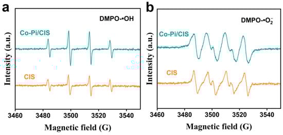 Electron paramagnetic resonance (EPR) spectra of (a) hydroxyl radicals (•OH) and (b) superoxide radicals ) trapped by 5,5-Dimethyl-1-pyrroline-N-oxide (DMPO) in the CIS and Co-Pi/CIS dispersion solution.